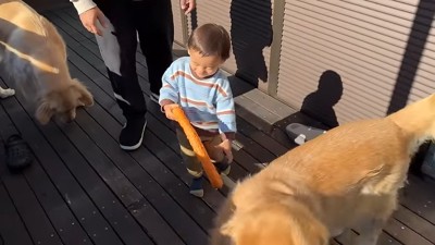 投稿主さんのお家で暮らしているゴールデンレトリバーの「ジョイ」くんと「マックス」くんは、元気一杯の男の子!末っ子だったマックスくんは、投稿主さんの1歳の息子「まさき」くんが生まれてお兄ちゃんになりました。