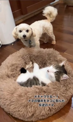Instagramに投稿されたのは、犬が猫にベッドを奪われてしまったときの様子です。犬はなんとかベッドを取り返そうと奮闘するものの、猫はなかなか手強くて…?