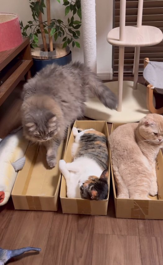『3つのダンボール箱』が猫で満室になるかと思ったら…まさかの『衝撃の展開』が285万再生「なんで…w」「可愛い」とSNSで話題