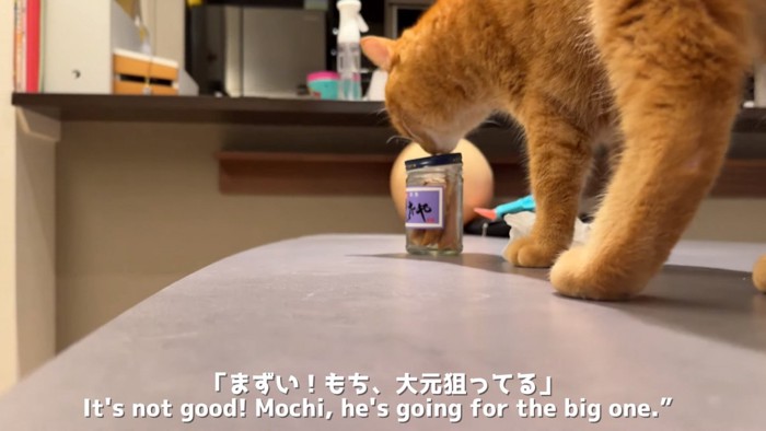 もちくんは気にすることなく、今度はくさやの入った瓶を狙いに。もちろん止められてしまいましたが、くさやのなにがそこまでもちくんを魅了するのでしょうか。