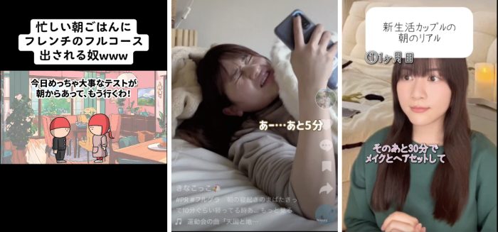 最後は、一人芝居スタイルで話題の「岩崎世奈」さん。動画では、理想と現実が乖離していく新生活の朝をユーモラスに表現。最初は余裕のある朝だったのに、いつの間にか30分前起床が当たり前に。朝食よりも身だしなみに時間を取られるリアルな変化が、多くの若年層の共感を呼んでいる。