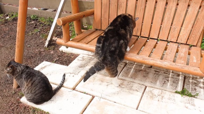 その後は「はな」ちゃんもやってきて、揺れるブランコの上、2匹で過ごしていたとのこと。