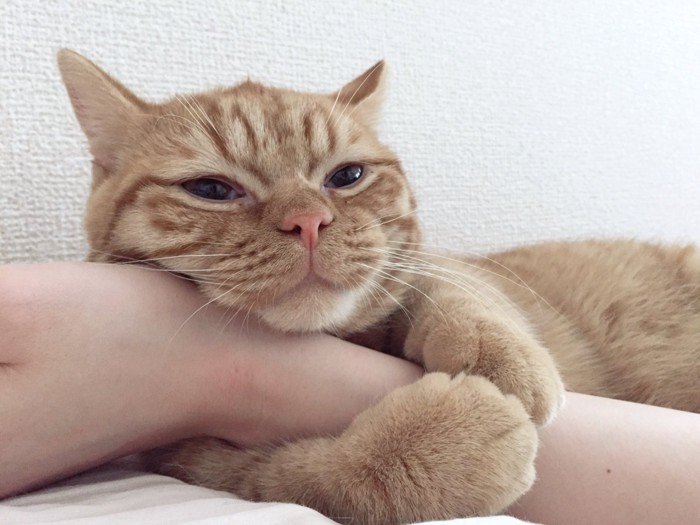 Xアカウント「necole」に登場したのは、茶トラの猫ちゃん。飼い主さんいわく、とっても甘えん坊な男の子で、この日も飼い主さんの腕をギュッと掴んでくつろいでいたそうです。