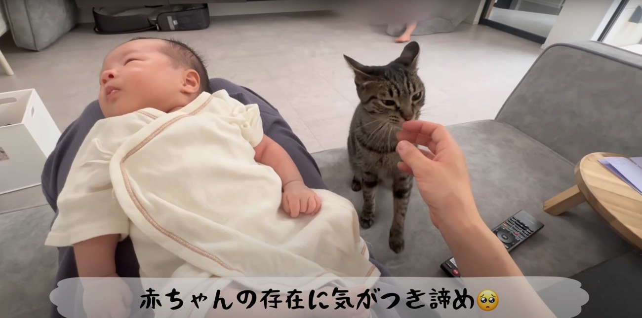 娘ちゃんに構ってもらえなかったももまるちゃんは、次に赤ちゃんの面倒を見ているママさんの下へ。「ママ~、構って~」と甘えに来てママさんの膝に乗ろうとしますが、ももまるちゃんは赤ちゃんの存在に気づいて、乗るのを諦めたのだとか。構ってほしくても赤ちゃんを優先してあげるなんて、本当に優しいお姉ちゃん猫ですね。