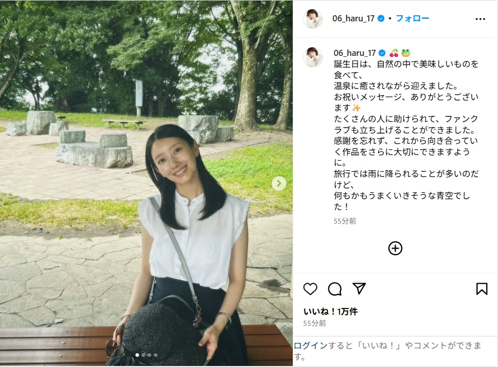 波留は「誕生日は、自然の中で美味しいものを食べて、温泉に癒されながら迎えました。お祝いメッセージ、ありがとうございます」と報告し、写真を投稿。自然の中で笑顔を見せる姿や、美味しそうなご飯との写真など、旅先でリラックスした姿のオフショットを披露し、「たくさんの人に助けられて、ファンクラブも立ち上げることができました。感謝を忘れず、これから向き合っていく作品をさらに大切にできますように」と伝え、「旅行では雨に降られることが多いのだけど、何もかもうまくいきそうな青空でした!」とつづった。