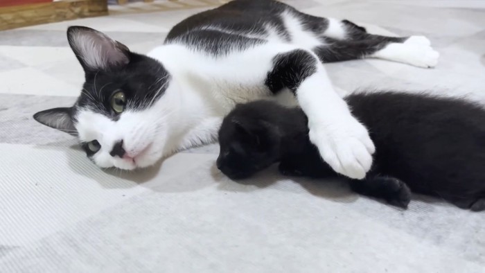 アリスちゃんの息子猫・クマくんを左前足でそっと抱き寄せる様子も