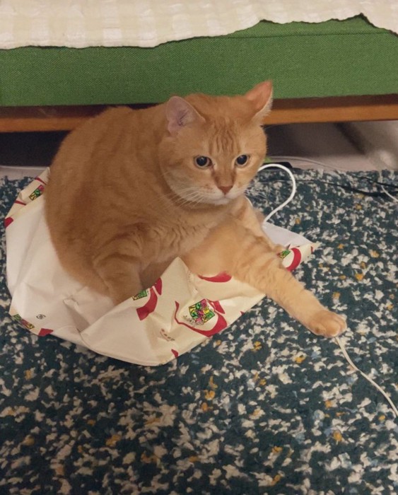 X(旧Twitter)アカウント『charoumaru』に投稿されたのは、紙袋にすっぽり収まった茶トラの猫の顔に、ちょうど紐がかかって“目元ぼかし”状態になってしまっている光景です。