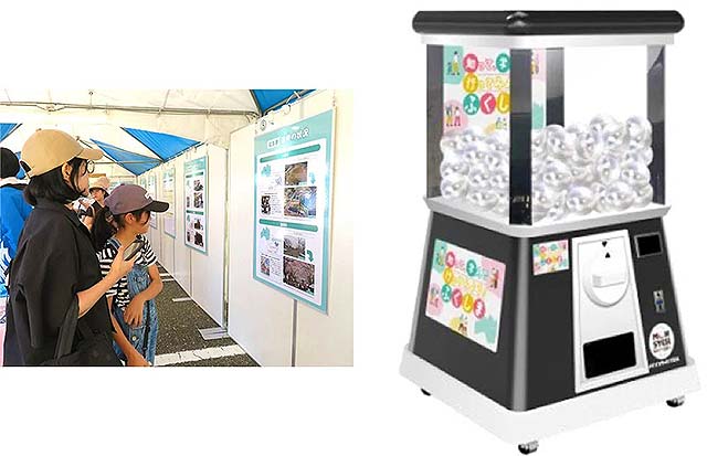 パネル展示を見てアンケートに答えると、お菓子や福島を応援する「ベコ太郎」グッズなどが当たる高さ約2.4mの巨大ガチャにチャレンジできるぞ。