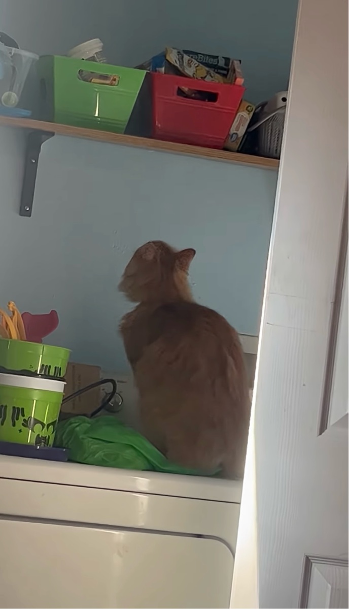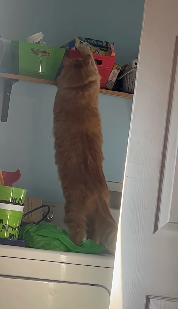 棚の箱に入ったおやつをナイショで取ろうとしたけれど・・。ネコのイタズラを目撃!【アメリカ・動画】