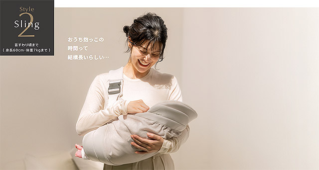 スタイル2:おうちでの長めの抱っこや短時間の外出ならスリング ママと目が合うから安心 手首の負担を抑えながら首すわり前の赤ちゃんを安定して抱っこ