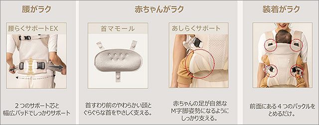 さらに、「M 字脚サポート」(特許出願中)により赤ちゃんの自然な M 字脚に沿った抱っこ姿勢を守ってくれる。
