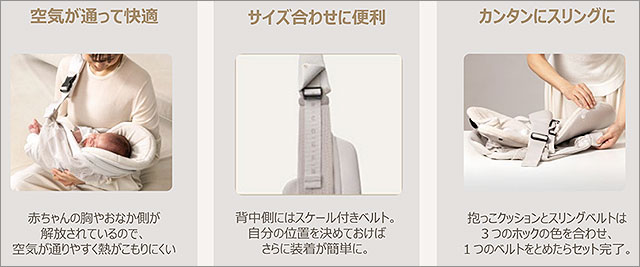 「腰がラク」「赤ちゃんがラク」「装着がラク」の 3 つのラクで、たくさん抱っこして、いっぱいお出かけしたいというママ・パパの想いに応えてくれる。