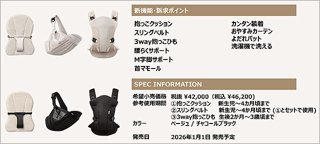 ベビー用品ブランド アップリカ(Aprica)から、生まれてすぐから3歳ごろまで使える 3WAY 抱っこひも「クルム ファースト」が2026年1月1日から全国ベビー用品専門店・百貨店に登場。