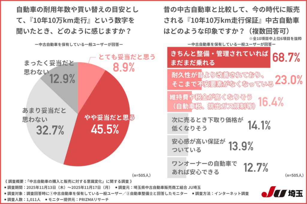 市場の変化を感じつつも、明確な答えがつかめないまま迷ってしまう人は少なくないはずだ。中古車の“寿命”に対する共通認識は、果たして今どこまでアップデートされているのか。そこで今回、埼玉県中古自動車販売商工組合 JU埼玉(https://ju-saitama.com/)は、中古自動車を保有している一般ユーザーと自動車整備士を対象に、「中古自動車の購入と販売に対する意識変化」に関する調査を実施した。