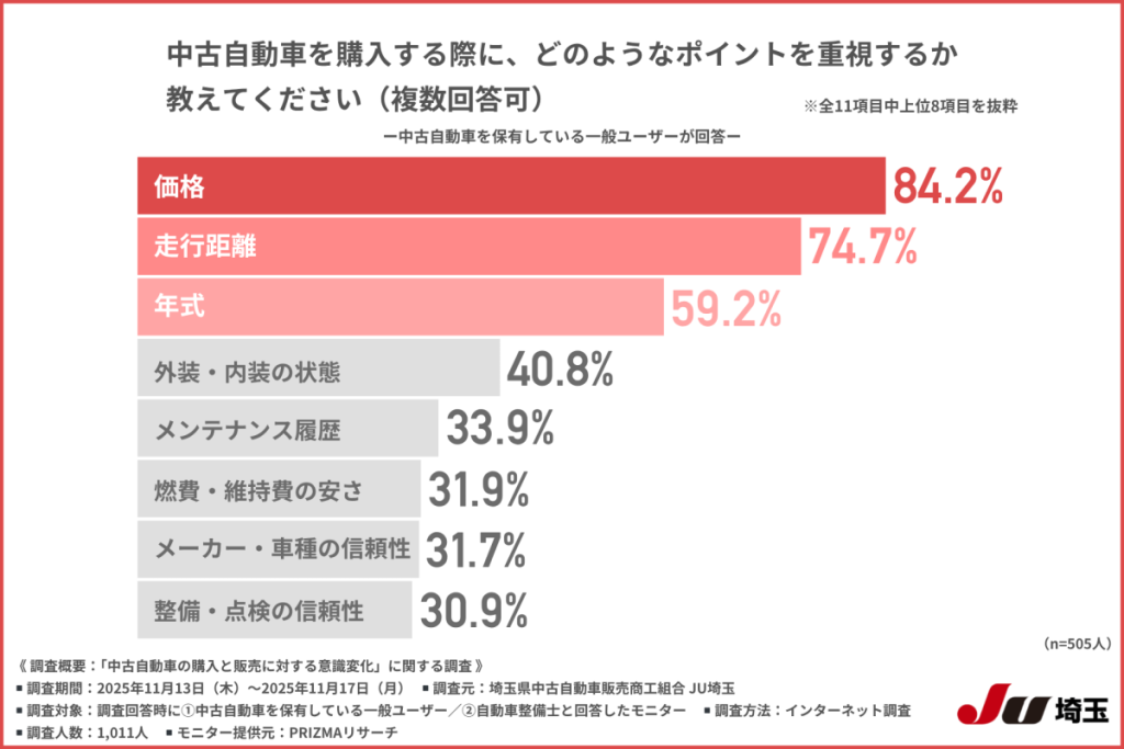調査結果によると、中古車購入時に最も重視されるのは「価格」(84.2%)で、続いて「走行距離」(74.7%)、「年式」(59.2%)が挙がった。購入判断の中心に基本スペックがあることは今も変わらない。
