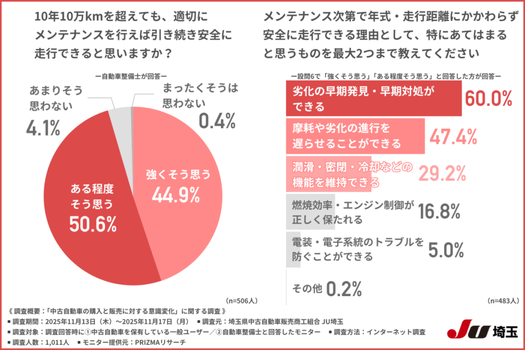 消費者の意識が変わりつつある一方で、実際に車の状態を見守る整備士たちはどう考えているのだろうか。調査では、「10年10万kmを超えても適切な整備を行えば安全に走行できるか」を尋ねたところ、「強くそう思う」44.9%、「ある程度そう思う」50.6%と、9割以上の整備士が肯定的な見解を示した。その理由として最も多く挙がったのは「劣化の早期発見・対処ができる」(60.0%)。続いて「摩耗や劣化の進行を遅らせられる」(47.4%)、「潤滑・密閉・冷却などの機能を維持できる」(29.2%)が続き、日頃のメンテナンスによって車の寿命は大きく変わるという根拠が示されている。