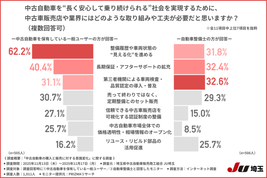 さらに「安心して長く乗り続けられる社会のために必要な工夫」を尋ねた設問では、ユーザー・整備士ともに「整備履歴の見える化」「長期保証やアフターサポートの充実」が上位に並んだ。いずれも、中古車の“状態と安心”を正直に伝える仕組みを求める声が強い。