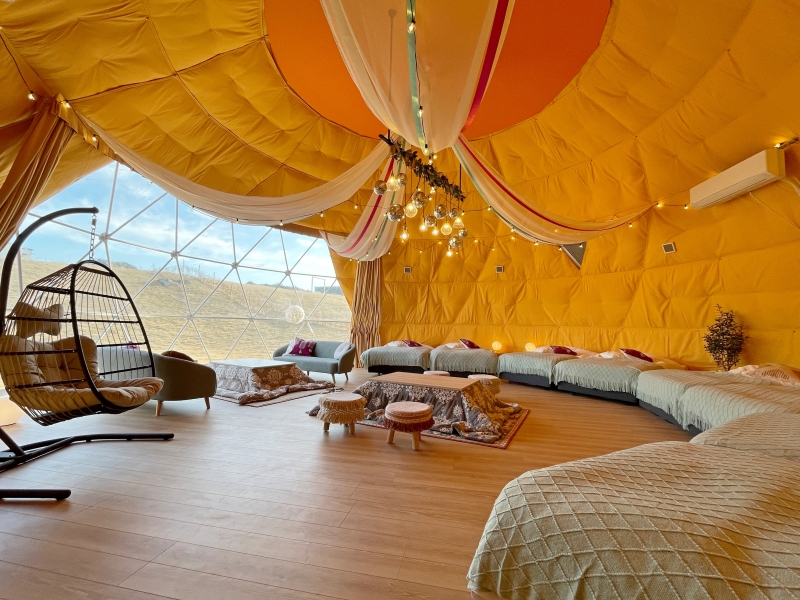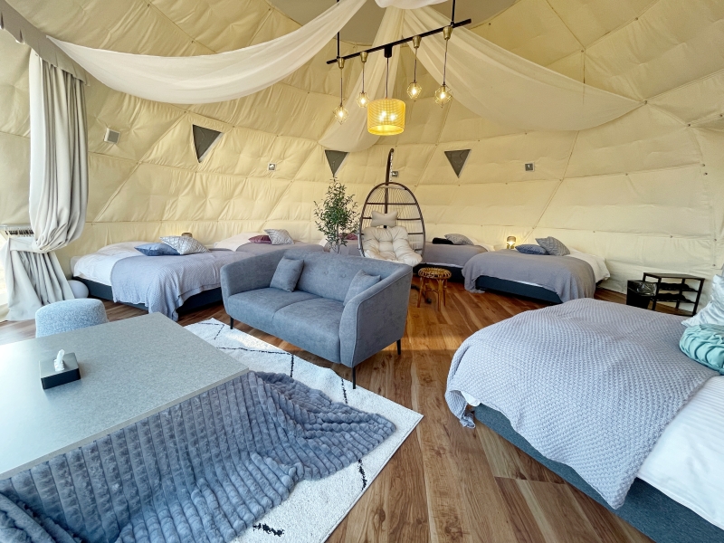 友だち同士やカップル向けの「スタンダードドーム(7m)」、家族で滞在できる3~4人向けの「デラックスドーム(8m)」、そして三世代ファミリーや友人グループ向けの「プレミアムドーム(10m)」があります。