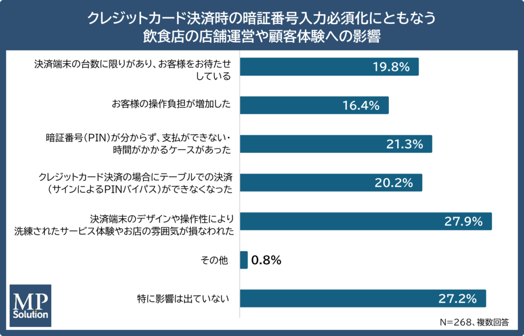 調査対象の72%が、暗証番号入力必須化により「顧客体験に影響が出ている」と回答している。特に、決済端末のデザインや操作性が原因で、「洗練されたサービス体験や店舗の雰囲気が損なわれた」との声が約3割にのぼった。これまで高級店などで主流だったテーブルでのサイン決済ができなくなり、これまでの接客の流れが変わってきている現状が浮き彫りとなった。