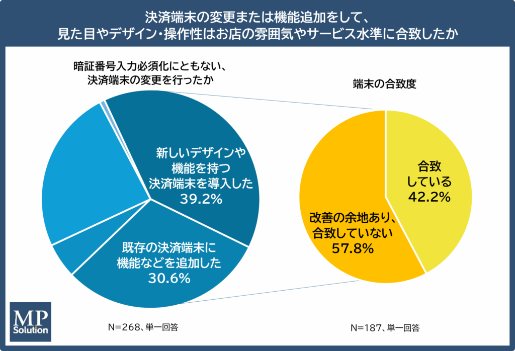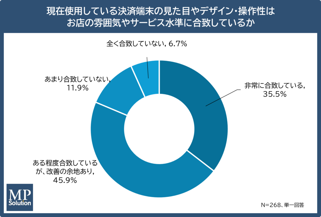 実際に、約7割の店舗が制度変更に合わせて決済端末の新規導入や機能追加を行っている。しかし、対応したにもかかわらず、現在採用している端末のデザインや操作性について、64.6%が「改善の余地がある・お店の雰囲気やサービス水準に合致していない」と回答しているのである。多くの店舗が、新しい端末に対して「もっとこうなれば」という思いを抱えているのが実情だ。