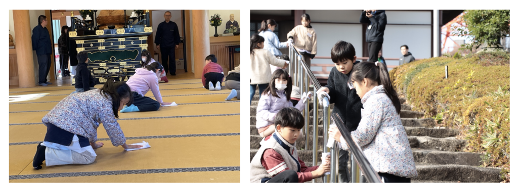 続いては、奉仕活動として圓光大師堂の畳掃除と大殿の階段の手すり磨きを行いました。