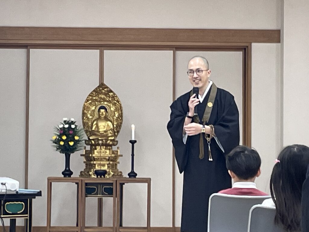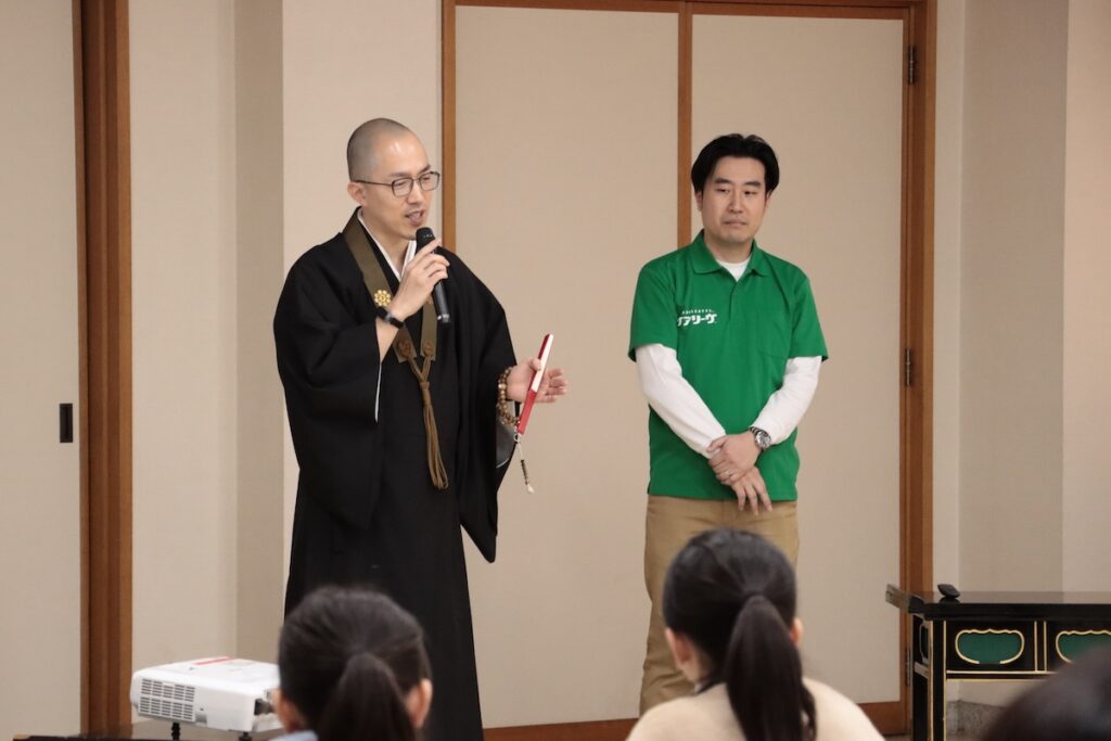 まず、増上寺 アドバイザー 僧侶(法律家)の堀江 利昌(ほりえ りしょう)さんが登壇し、心に響く説法が行われました。堀江さんは、「手当」という言葉の原点が、痛いところに手を当てる行為から始まったことを説明。手を当てることで、単に痛みが和らぐだけでなく、「心が温まる」という精神的なつながりが生まれると語りました。そして、「人は一人では生きられない。手当をすることは、私たちがみんなでつながっていることに気づくきっかけになる」と、子どもたちにも伝わる優しい言葉で、想いやりの大切さを説きました。