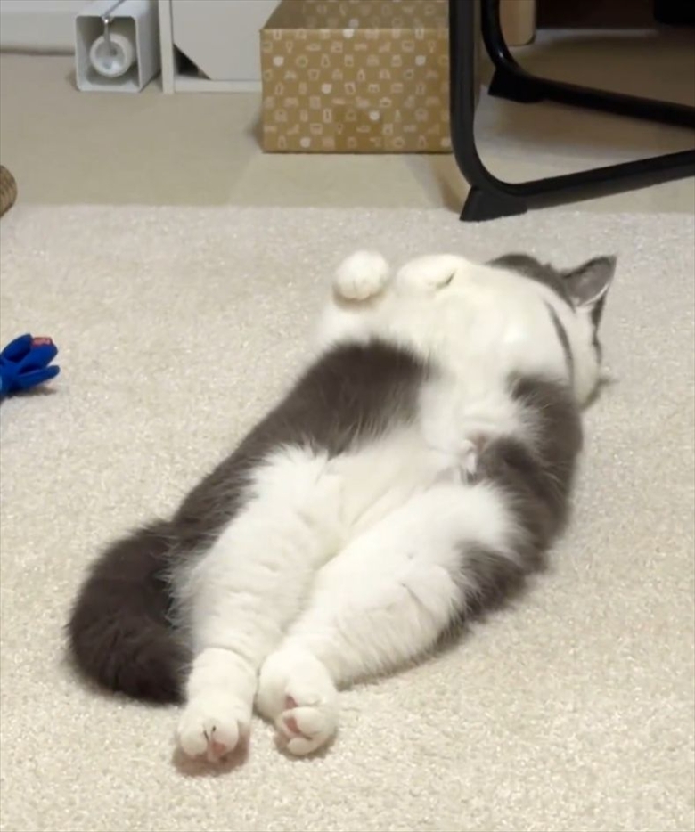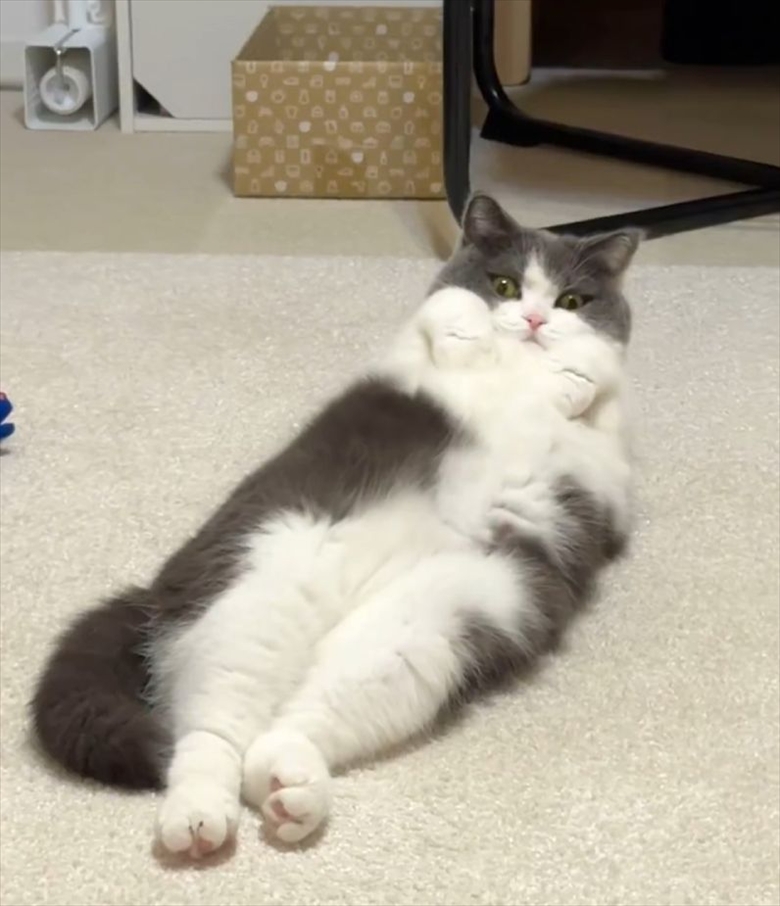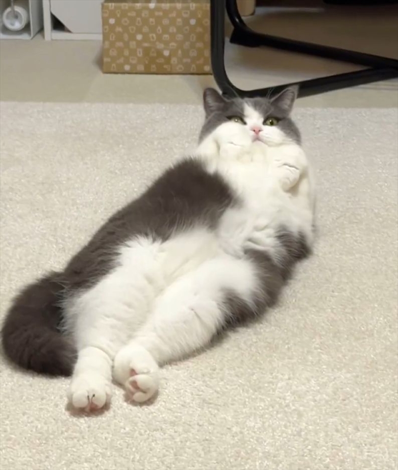 疲れてリビングに来たら・・一瞬で癒された!ゴロリと寝転がりリラックスしてるネコに反響「モフモフしたい」「腹筋鍛えがち」