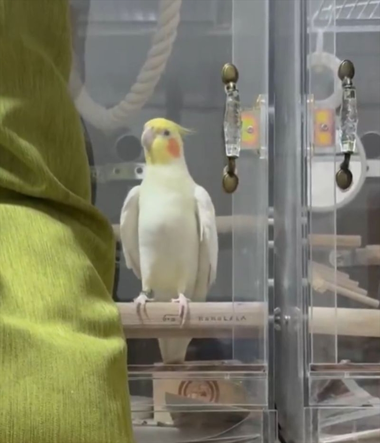 飼い主さんが帰宅したことに喜ぶオカメインコ。