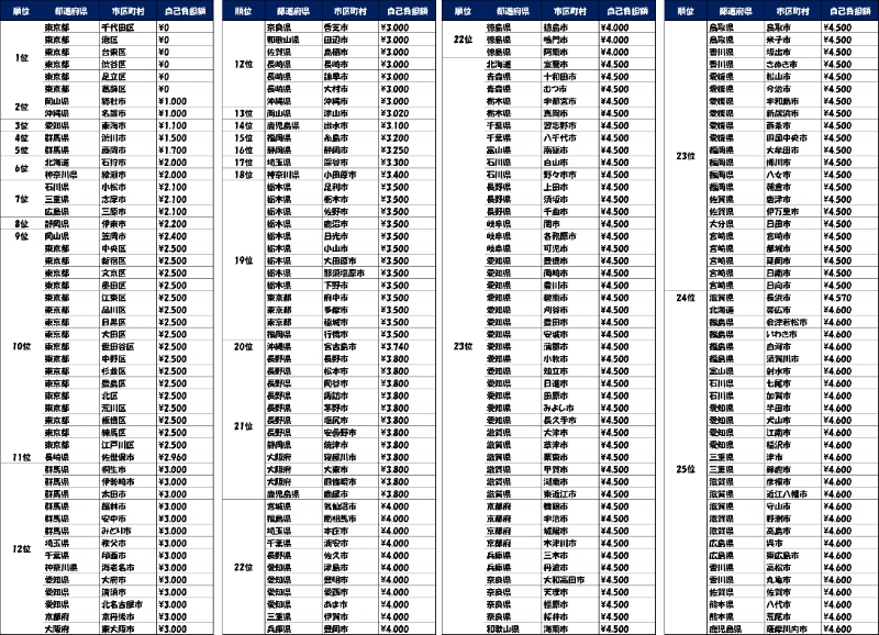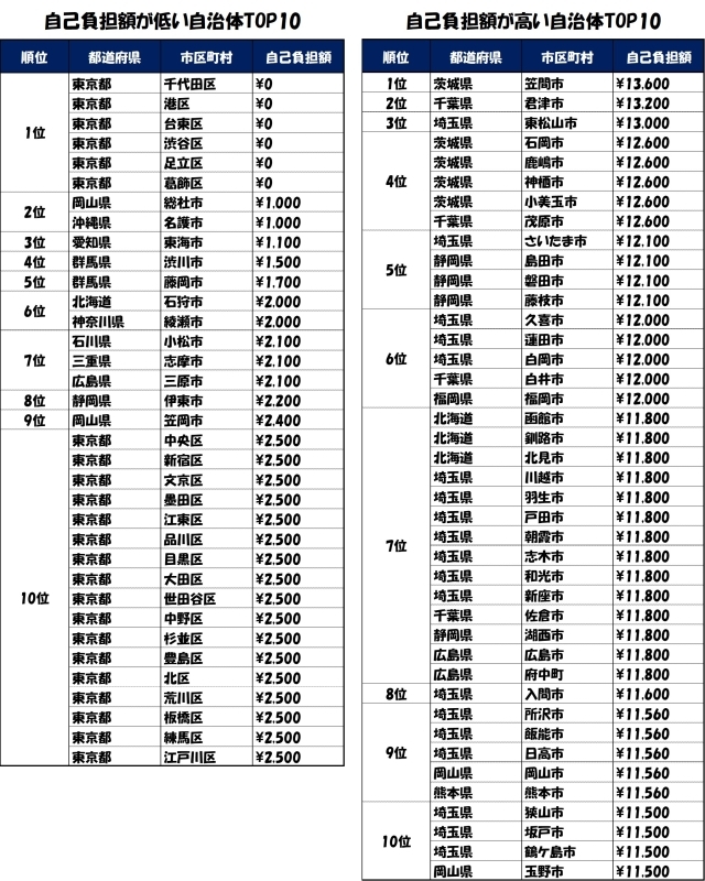 人口5万人以上の549自治体を対象にした自己負担額ランキング