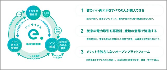 50以上の自治体が参画する e.CYCLE(いいサイクル)は、再エネの「地産地消」と「都市間流通」を通じて、地域活性化と再エネ利用の拡大をめざすアグリゲーションプラットフォーム。