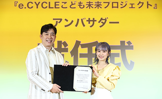 今回、e.CYCLE こども未来プロジェクトアンバサダーに就任した あべこうじ に、アンバサダー任命書を授与する役として、妻の高橋愛も登場。