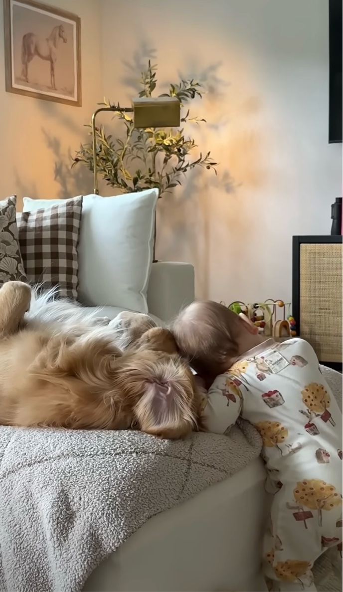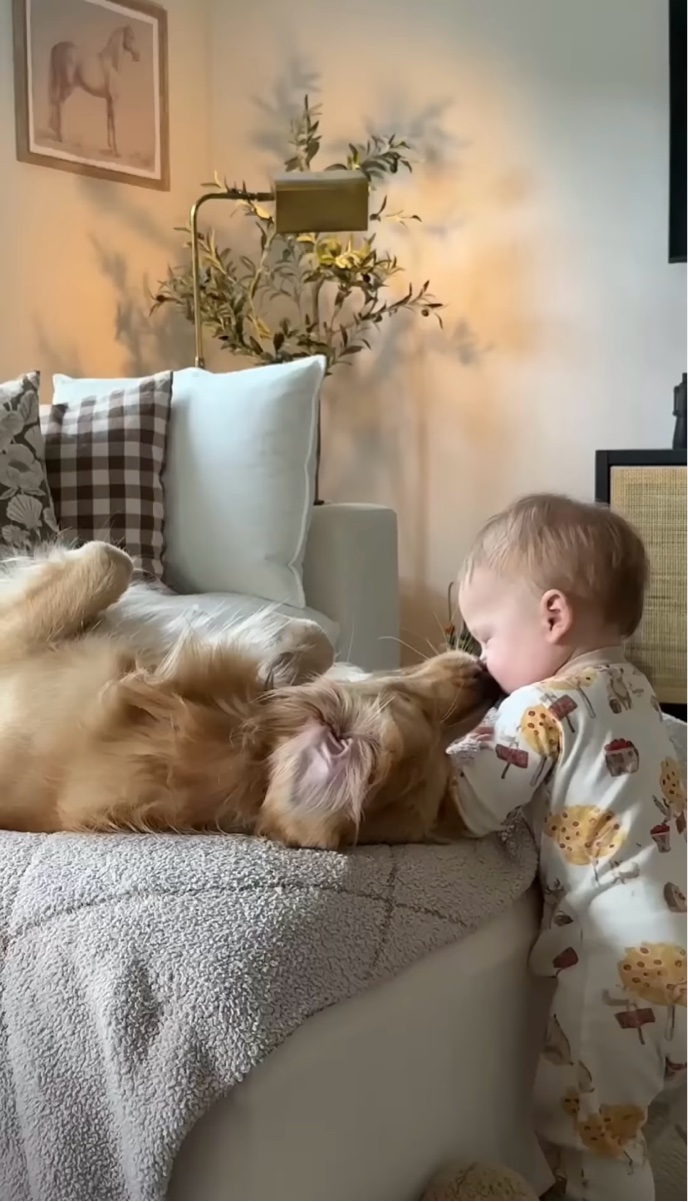 頭を寄せ合ったり、赤ちゃんのおててをゴールデンレトリバーがペロペロしたりと、ふたりの絆は非常に深いのです!