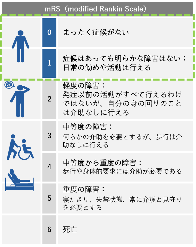 mRS(modified Rankin Scale)は、脳卒中後の後遺症の程度や、日常生活の自立度を評価する国際的な指標。0:後遺症なし1:軽い症状はあるが日常生活は自立2:身の回りのことは介助なしで可能など、0〜6の段階で評価され、治療効果を判断するうえで重要な基準とされている。