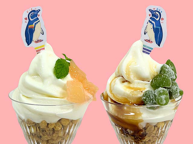 すみだ水族館 ペンギンカフェでは、新たに夫婦になった「ピーチ」と「おもち」をイメージした2種類のミニパフェ(600円)も登場。