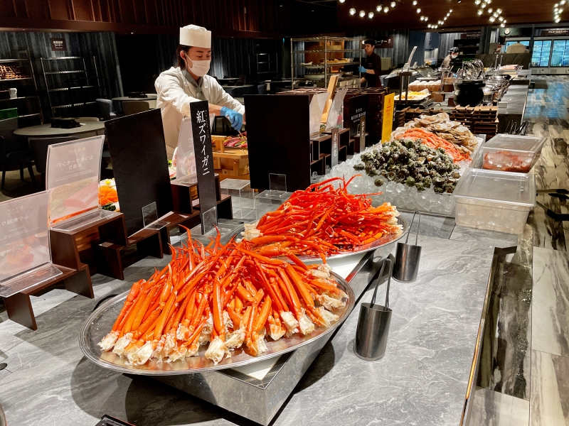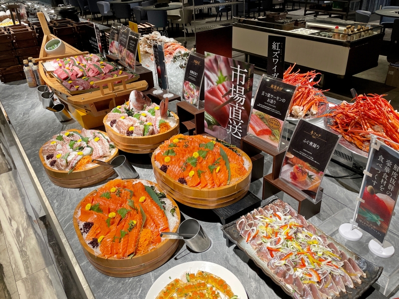 ブッフェ台を彩るのは、鮮度抜群の旬の海鮮を使ったお造りやお寿司の数々。サザエやほたて、はまぐりなどを各テーブルで仕上げる「海鮮浜蒸し」は、大江戸三つ星バイキングの看板メニューです。