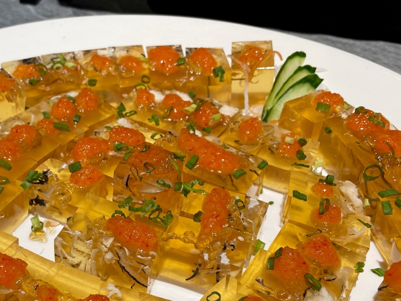 中でもおすすめなのが「ふぐ煮凝り」です。プルッとした食感と、酸味のあるジュレが口の中ではじけ、さっぱりした味わい。心ときめく輝きが、お食事時間を華やかに彩ります。