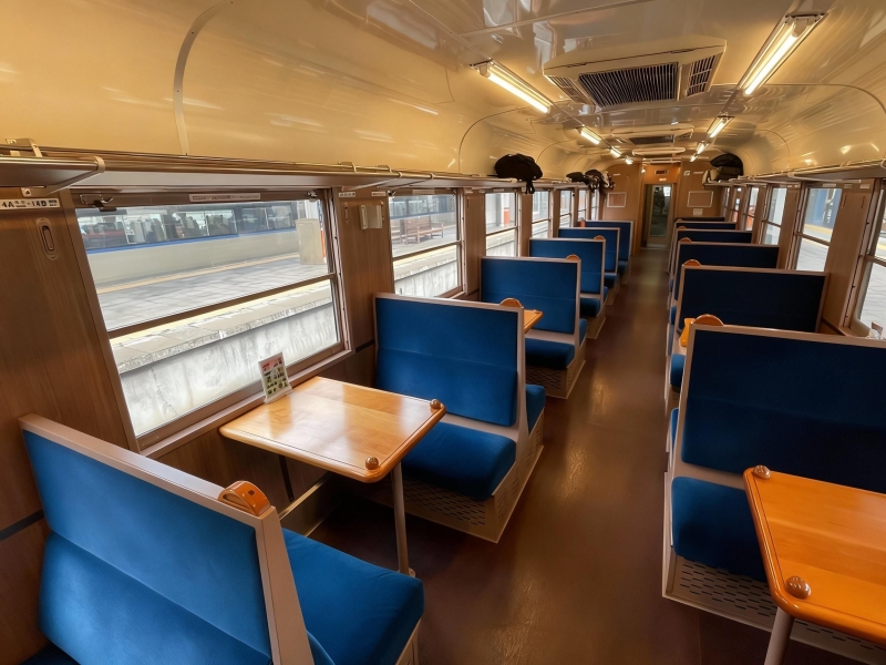 昭和のSL全盛期を彷彿させる趣のある内装。ボックスタイプのシートはふかふかで、直角の背もたれにどこか懐かしさを感じます。備え付けのテーブルは駅弁を広げるのに最適なサイズ。ここには、古き良き時代の旅情あふれるシーンが息づいています。