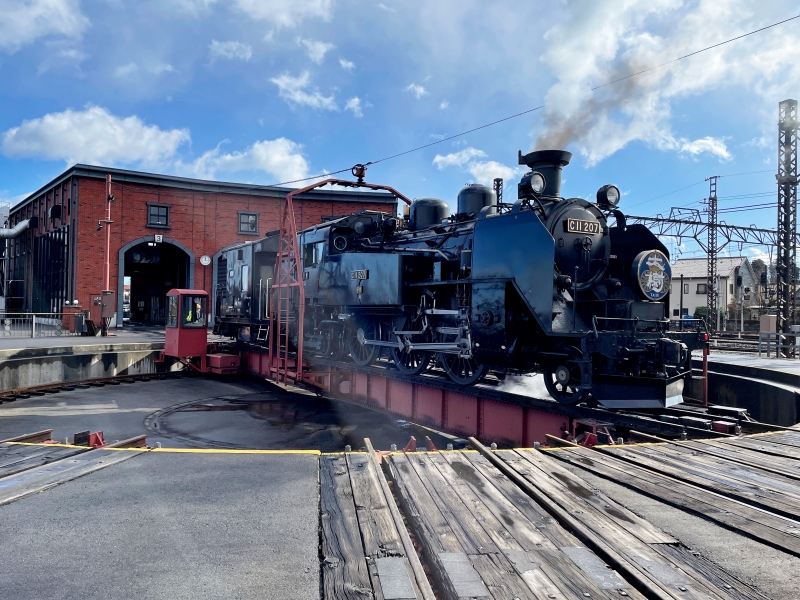終点の下今市駅に到着したら、駅に隣接する転車台へ足を向けてみます。先ほどまで力強く走り続けていたSLが、役目を終えて車庫に戻る姿を目の前で見ることができます。その雄姿に、シャッターを切る手が止まりません。