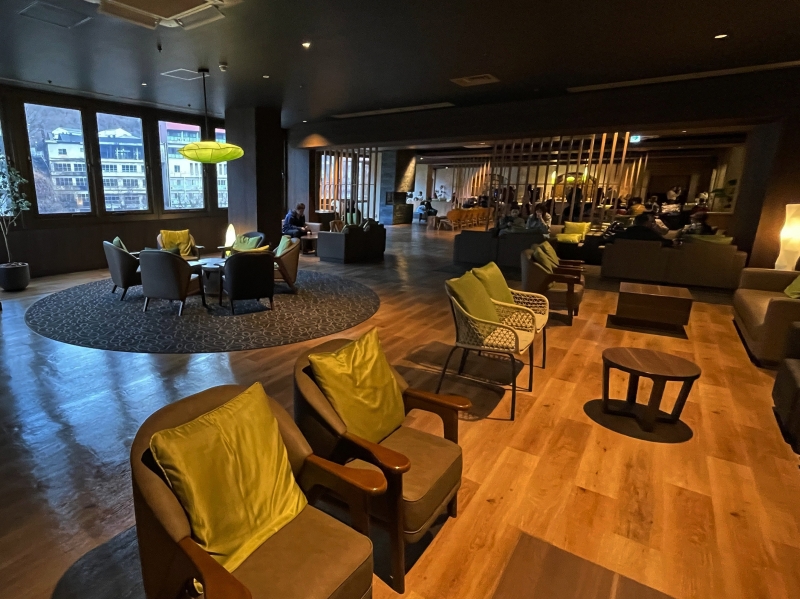 ロビーの奥は、ゆったりした空間がとられたプレミアムラウンジ。ソフトドリンクやアルコール類が、ウェルカムドリンクとして無料で提供されています。