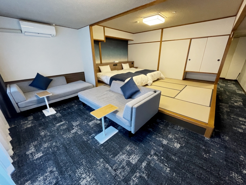 客室は、4人まで泊まれる「スーペリア和ベッドツイン」。白とブルーを基調とした清潔感のある空間で、窓からは鬼怒川のせせらぎが一望できます。