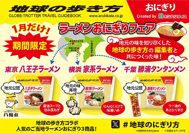 ミツハシは、「ラーメンおにぎりフェア」を開催し、人気旅行ガイドブック『地球の歩き方』と共同開発し、ご当地ラーメンの味わいを再現したおにぎり3品「横浜家系ラーメンおにぎり」「千葉勝浦タンタンメンおにぎり」「八王子ラーメンおにぎり」を 1月2日~1月31日 の期間限定で、関東を中心としたスーパーマーケットで販売。
