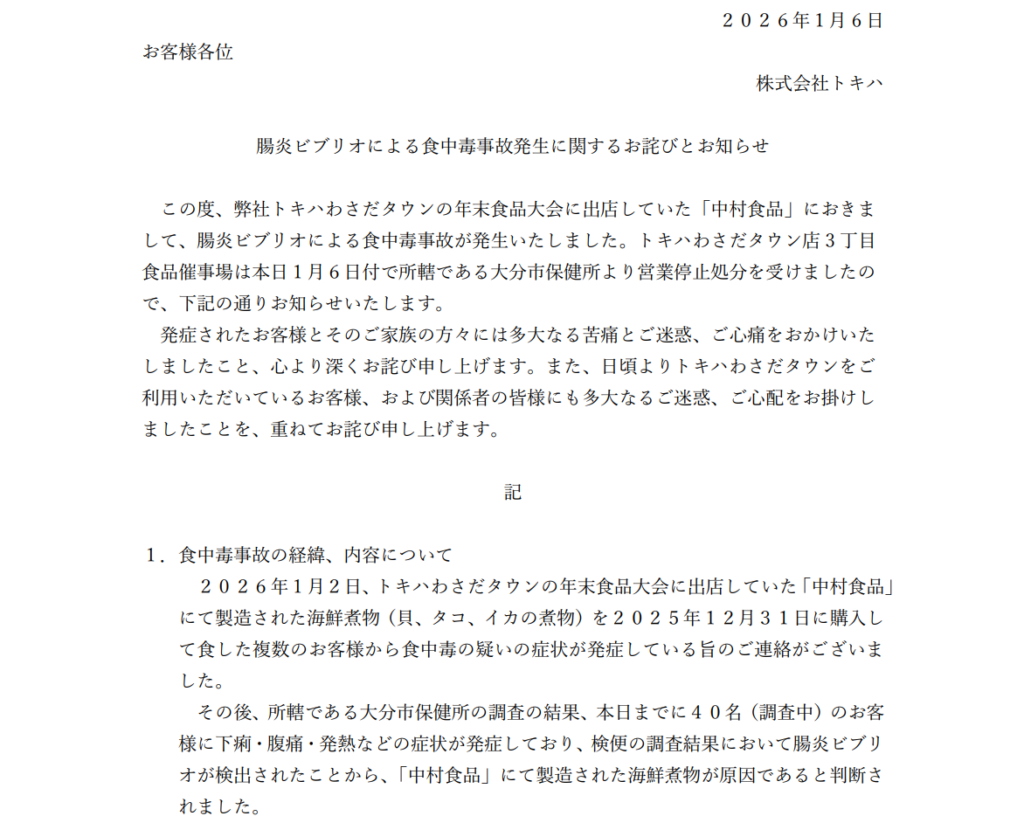トキハは、ホームページ上で「発症されたお客様とそのご家族の方々には多大なる苦痛とご迷惑、ご心痛をおかけいたしましたこと、心より深くお詫び申し上げます」と謝罪した。
