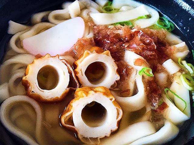 たまたまおうちにあったレンチンうどん(レンチンきしめん)に、ねぎ、かつおぶし などといっしょに、輪切りにした寿隆蒲鉾「あご野焼」を加えて、いただきまーす☆