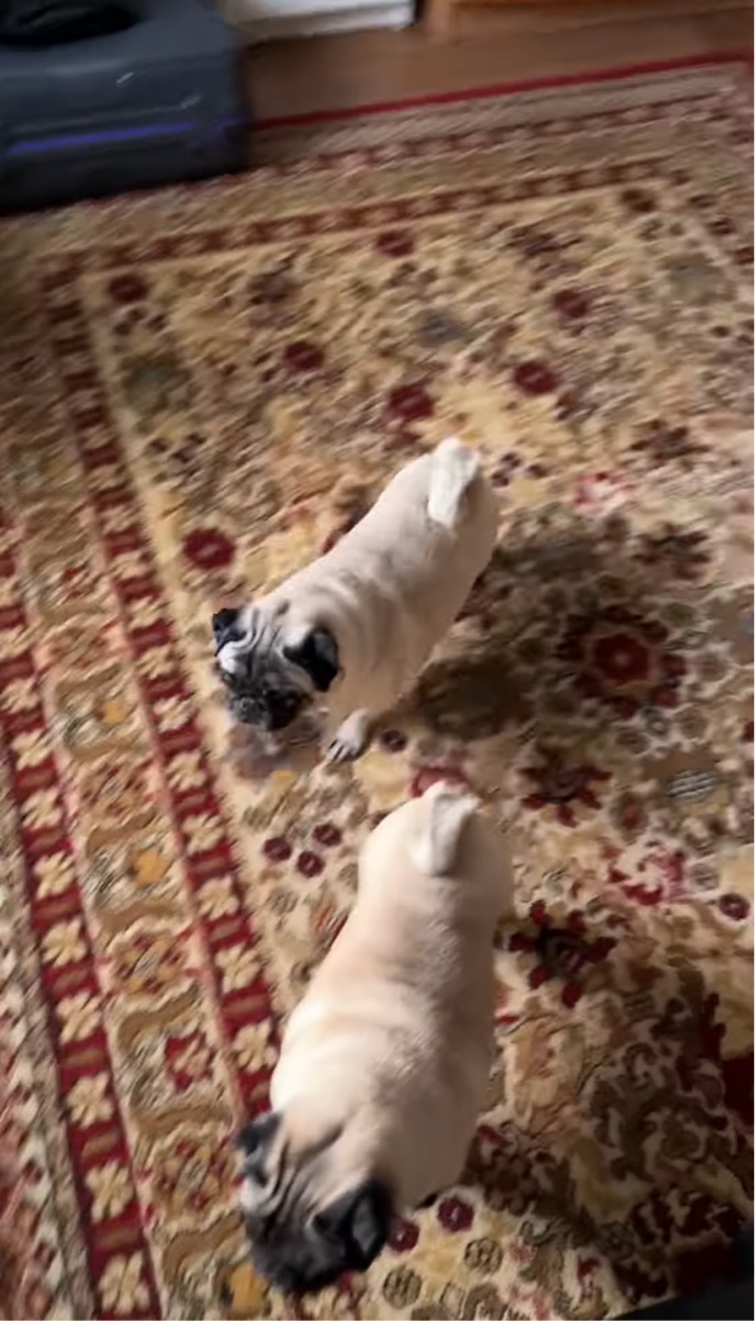 その音を聞きつけた、愛犬のパグたちが駆け寄ってきました!