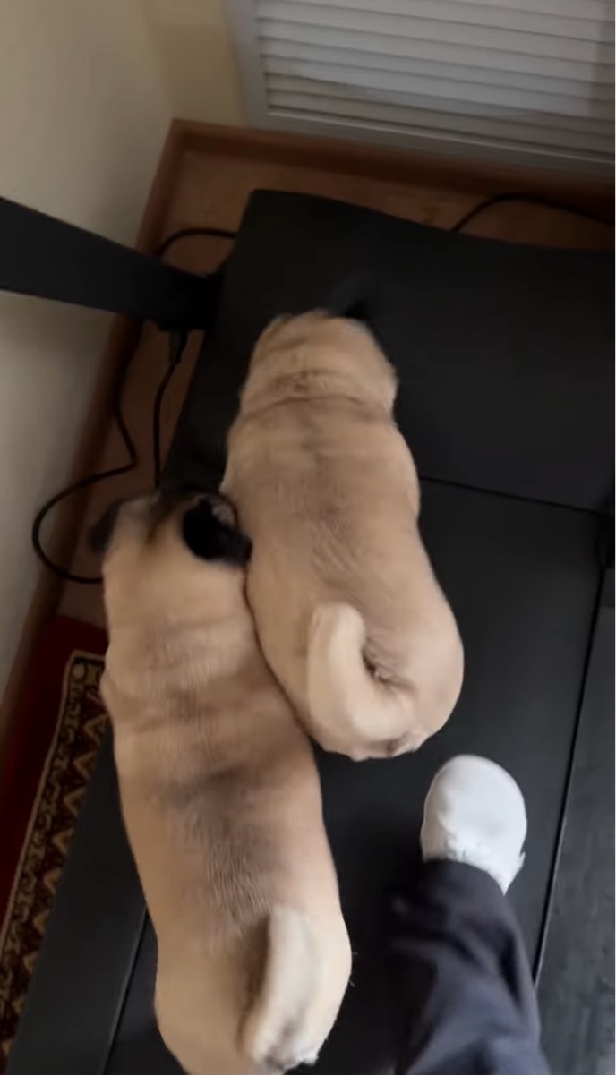 一緒にウォーキング?飼い主さんを押しのける勢いでパグたちがウォーキングマシンの上を歩く!!【海外・動画】