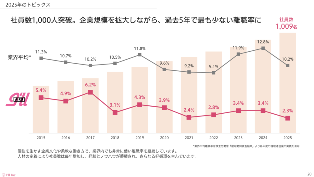 図のように離職率2.3%は業界内でも非常に低い水準を維持していますが、福利厚生の充実や在宅勤務の環境整備など、社員が生き生きと働ける職場づくりに力を入れている成果なのではないでしょうか。