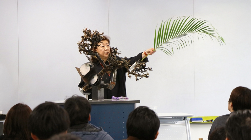 家庭でのいけばなはもちろん、ウインドーディスプレーや舞台美術など、社会のさまざまな空間に植物表現の可能性を広げています。