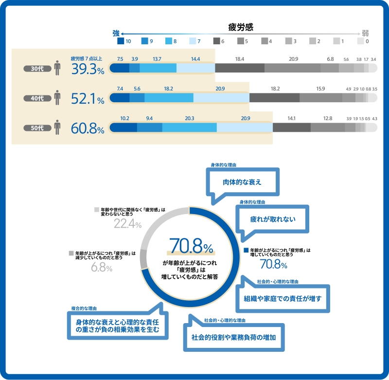 年齢を重ねるにつれて、その疲労感が強まる傾向も見られ、疲れている状態が「特別なこと」ではなく「当たり前」になっている現実が見えてきます。