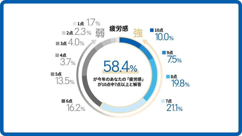 多くの人が、今年の自分の疲労感を高い点数で評価しています。中には「かなり強い疲れ」を感じている人も少なくありません。それでも日常は変わらず続き、疲れている状態そのものが、いつの間にか当たり前になっています。