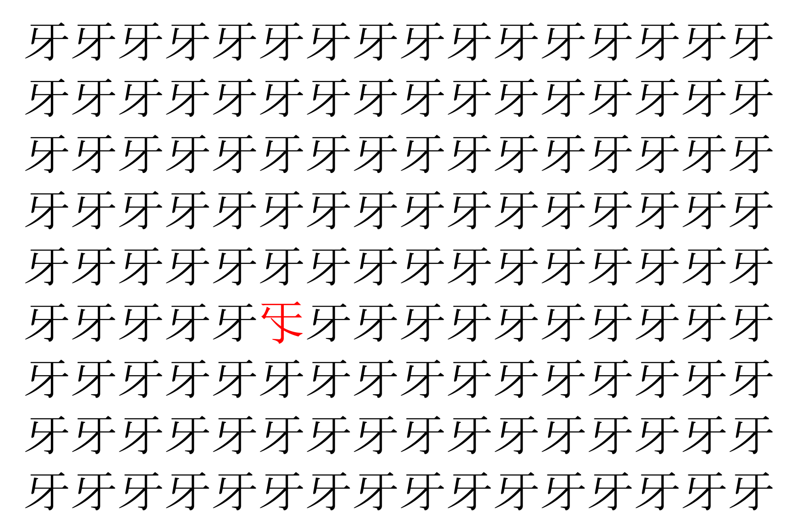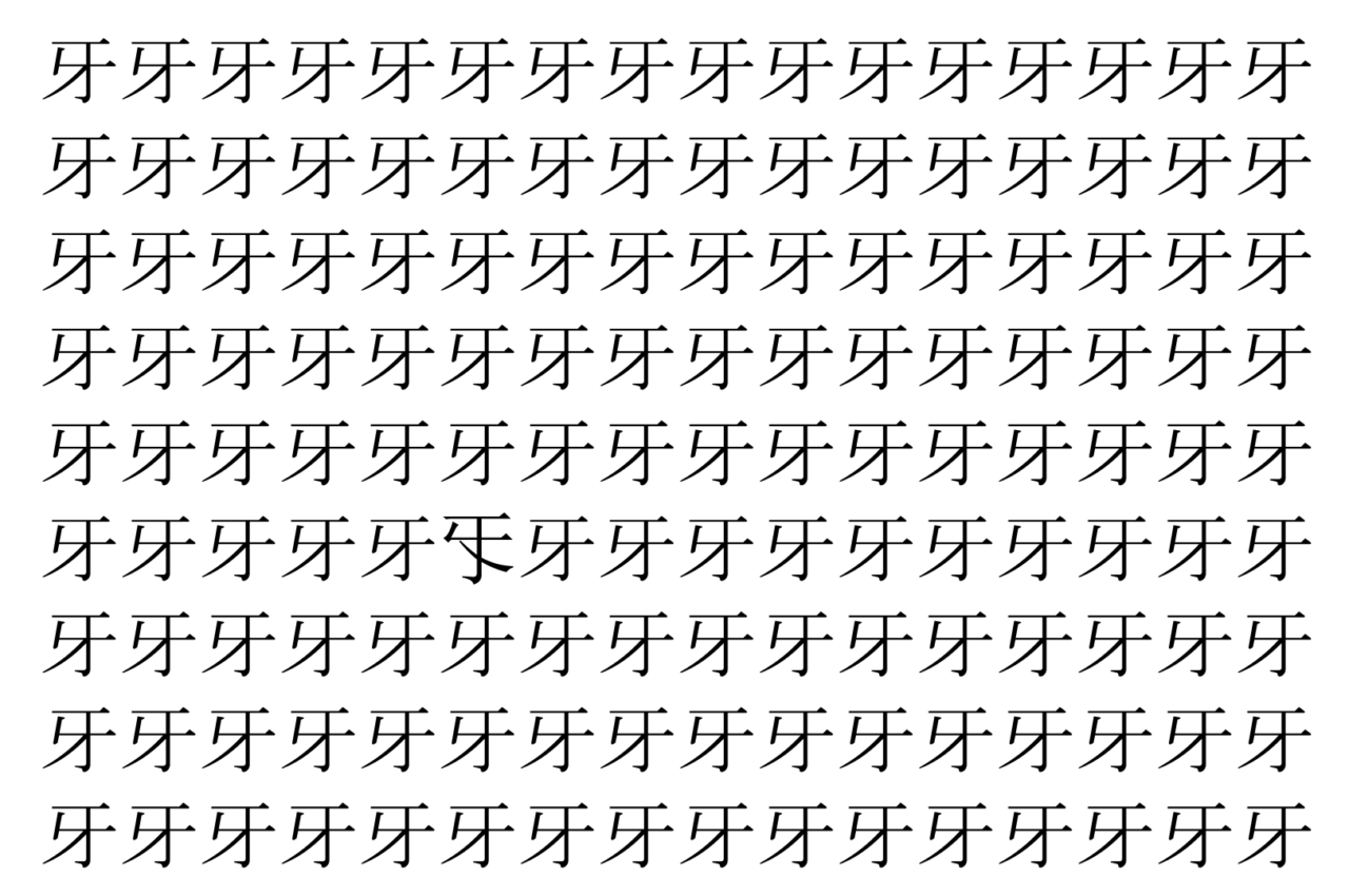 【脳トレ】「牙」の中に紛れて1つ違う文字がある!?あなたは何秒で探し出せるかな??【違う文字を探せ!】